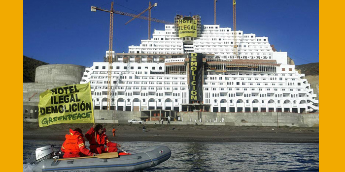 En 2003 comenzó la construcción de El Algarrobico, una enorme mole a tan sólo 14 metros del mar, en la playa homónima situada dentro de los límites del Parque Natural del Cabo de Gata. En 2009 se detuvieron las obras a causa de una denuncia de vulneración de la Ley de Costas, pero tras años de pleitos, aún no se ha tomado una decisión de qué se hará con esta edificación, que supone un daño medioambiental de proporciones inimaginables.