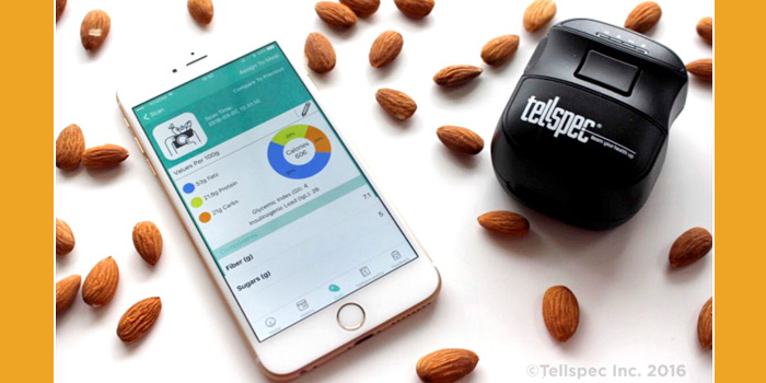 Tellspec Food Sensor es un espectrómetro infrarrojo portátil con conexión bluetooth que permite medir composiciones en alimentos. Se trata de un dispositivo “de bolsillo” que escanea los alimentos a nivel molecular. La solución está formada, además, por un sistema de análisis alojado en cloud y una App para smartphone. Con todo ello, es capaz de escanear alimentos, identificar calorías, macronutrientes, alérgenos y proporcionar información relevante relacionada con el fraude alimentario, la adulteración y la calidad alimentaria.