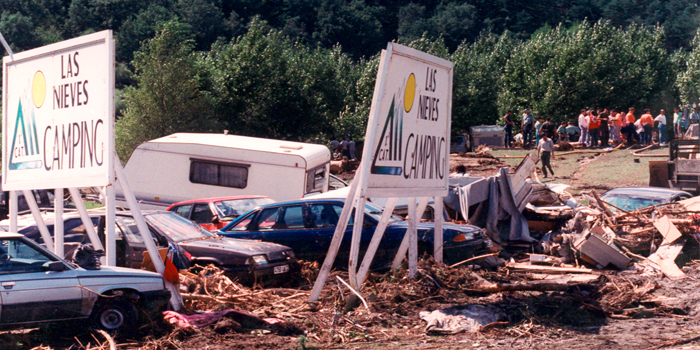 El verano de 1996 se vio sorprendido por una tormenta que provocó una enorme riada en la zona de Biescas en Huesca. El camping Las Nieve había sido construido en un cono de deyección o cauce natural de un río que ha sido desviado (el Gállego), fácilmente inundable, por lo que la corriente lo arrastró todo a su paso. Murieron 87 personas y otras 183 resultaron heridas. Los responsables fueron obligados a indemnizar a las familias afectadas y el camping se trasladó ¡a otro cono de deyección, de menor pendiente, pero igualmente riesgoso!